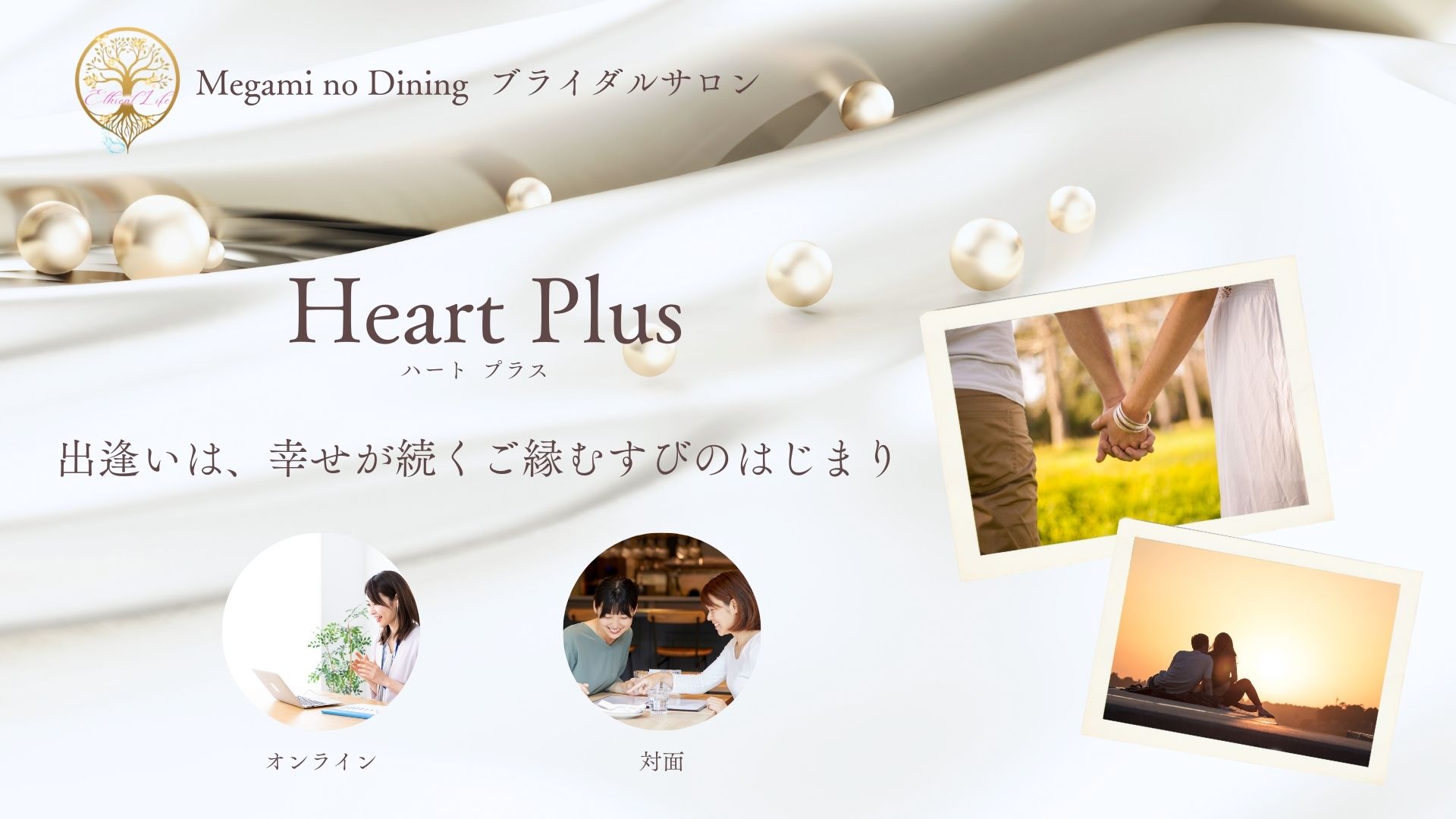 「出逢いは幸せが続くご縁結びのはじまり」 どこで、誰と繋がるか…。 それだけで、人生は本当に大きく変わります。 一度きりの人生、最高の幸せになることを諦めなくていいんです。 女神のダイニング HeartPlusでは、腸~食を学んだ専門のカウンセラーがサポートし、自然と心がほぐれて、未来へと続いていく “温かい人生を育むパートナー”と出逢える場を、やさしく提供しています。 『腸を整え、心が変わる。心が変わると、すべてがうまくいく』 誰もが、最高の幸せへとつながっていくチャンスが、ここにあるのです。